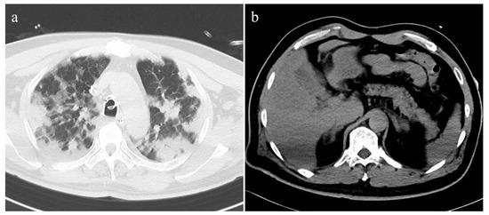 Unenhanced axial CT images of a 51-year-old male patient with severe COVID-19 pneumonia. (a) Chest CT showed extensive consolidations in both lungs. The lung severity score was 3.8. (b) Pancreatic steatosis and fatty liver were seen on the abdominal CT. The CT-FVF of the pancreas was 28.4% and the CT attenuation value of the liver was 46.9 HU.