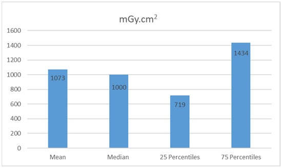The ICRP recommends using PKA, Ka,r, CTDIvol and dose-area product (DAP) as DRL quantities, depending on availability []. The machine measured in DAP; therefore, values are reported as such. For the DRL’s calculation, we used the dose-area product (DAP, Gy·cm2). In this calculation, we aimed to establish the typical values according to what represented a typical local practice at a single large centre or group of healthcare facilities, and the typical value set was the median value of the distribution of doses determined from patient samples [].