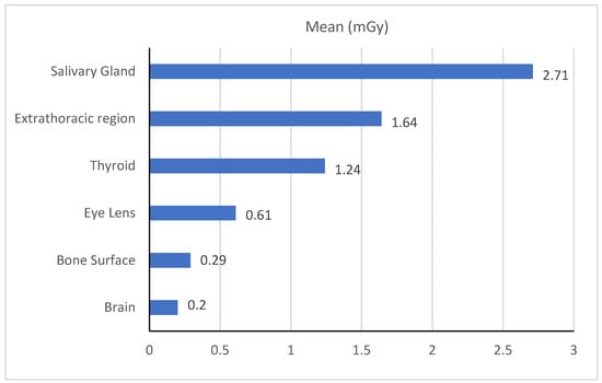 The current study calculated the effective dose based on tissue weighting factors and the organ equivalent dose using DAP []. The mean effective dose per procedure was 149.5 ± 56 µSv. In this study, the organ doses to the brain, bone surface, eyes lens, thyroid, extra thoracic region and salivary glands were 0.2, 0.29, 0.61, 1.24, 1.64 and 2.71 mGy per procedure, respectively (see Figure 2).
