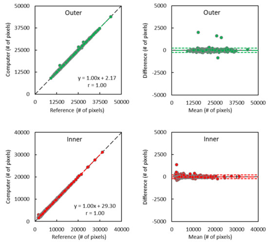 Pearson coefficients and Bland–Altman plots show excellent correlations and agreements between computer (convolutional neural network approach) versus reference (human) segmentation of the outer (green) and inner (red) abdomen regions. The dashed and dotted lines in Bland–Alman plots represent the bias and limits of agreement, respectively (mean ± 1.96 SD).