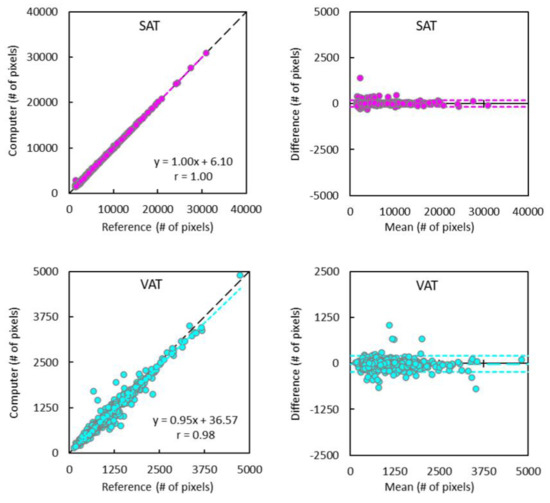 Pearson coefficients and Bland–Altman plots show excellent correlations and good agreement between computer (convolutional neural network approach) and reference (human) segmentation of subcutaneous adipose tissue (SAT) and visceral adipose tissue (VAT). The dashed and dotted lines in Bland–Alman plots represent the bias and limits of agreement (mean ± 1.96 SD).