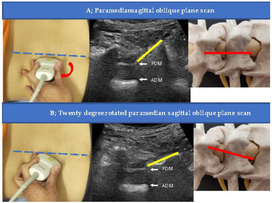 Figure 3. Direction of the probe during injection. The probe was rotated by 20° at the paramedian sagittal oblique plane to obtain the angle of the needle (A) to the obtuse dura mater and direct the needle tip to the midline, where the epidural fat layer is thickest at the lesion (B). The yellow line indicates the L5 lamina. Abbreviations: ADM, anterior dura matter; PDM, posterior dura matter.