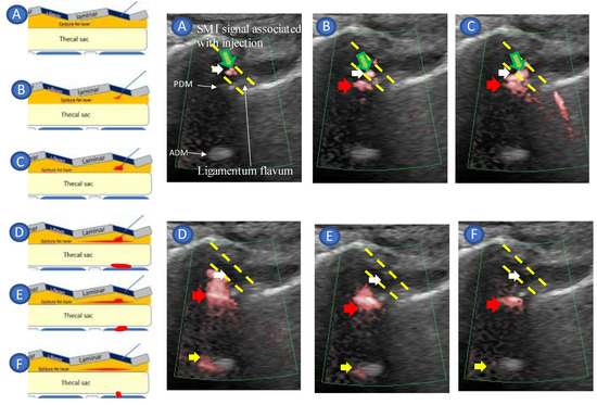 Figure 5. Paramedian sagittal oblique view (rotated by 20°) of the lumbar spine during real-time US-guided epidural injection. The inset shows the orientation of the transducer and the direction of the needle in which the Cathelin needle was introduced (in-plane) during the epidural injection. The Cathelin needle tip (white arrows) was embedded in the ligamentum flavum which was confirmed by observing the monitor before changing to SMI mode and by the ligamentous resistance tactile sensation transmitted to the syringe; the green arrow indicates the SMI signal in the ligamentum flavum associated with injection. The yellow dotted line represents the outline of the ligamentum flavum (A). When the ligamentum flavum ruptured and the SMI signal indicated by the red arrow appeared in the epidural fat layer (B,C), needle advancement was stopped, and the remaining injectant was injected. The SMI signal spread to the posterior indicated by the red arrow and anterior epidural spaces indicated by the yellow arrow (D,E). The SMI signal was localized in the posterior epidural space (F). While injecting the injectant, the SMI signal was monitored in the epidural space until the drug infusion was completed. Abbreviations: ADM, anterior dura mater; PDM, posterior dura mater; L.flavum, ligamentum flavum.