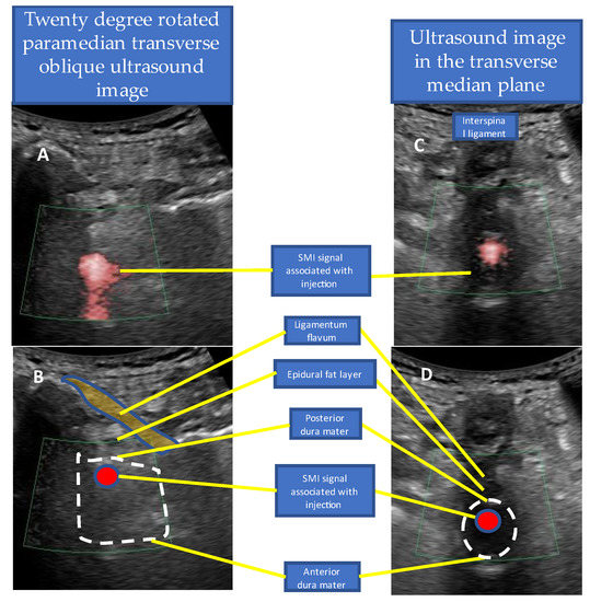 To evaluate whether the epidural ligament was correctly ruptured and the drug flowed into the epidural space, the SMI method was used as shown in the cervical epidural block. The advantages of this method are the accurate assessment of the needle tip position, real-time tracking of the spread of the drug, and the ability to visualize the intrathecal injection by dural puncture, which allows early interruption of the injection.