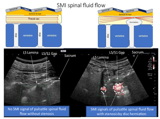 Peri-discal blood flow is a thin, narrow flow that is continuous to the base of the hernia and presents an SMI image in the epidural space, whereas CSF flow is a wider flow than this but does not flow epidurally, resulting in flow in the dural canal even if the stenosis is strong. In addition, CSF flow is susceptible to spinal extension, and SMI in the case of strong stenosis is not affected by inflammation around the intervertebral disc, whereas the SMI signal associated with CSF flow is also lost because CSF flow is lost with lumbar extension. The CSF flow is also more susceptible to SMI signal enhancement due to the dura mater being pushed down with an epidural block, whereas the inflammatory SMI signal in the disc is not affected.
