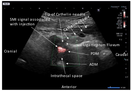 Figure 8. SMI steady-flow signal associated with injection. Paramedian sagittal oblique view (rotated by 20°) of the lumbar spine during real-time US-guided epidural injection. Abbreviations: ADM, anterior dura matter; PDM, posterior dura matter; SMI, superb microvascular imaging.