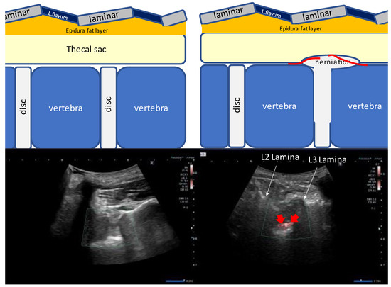 Figure 9. Paramedian sagittal oblique sonogram of the lumbar spine. Pulsatile SMI signal associated with inflammation. The (left) image shows no SMI signal at the L4/5 interlaminar spaces without disc herniation. The (right) image shows SMI signals indicated by a red line on the herniated disc. The SMI signals indicated by red arrows were detected as pulsatile flow in the epidural space between the epidural fat layer and the anterior dura mater. Abbreviations: L. flavum, ligamentum flavum; L, lumbar; SMI, superb microvascular imaging.