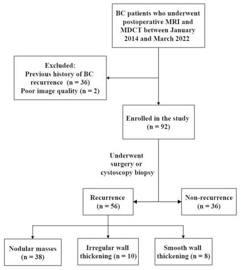 BC patients who underwent postoperative MRI and MDCT at our hospital between January 2014 and March 2022 were collected. Some patients had hematuria symptoms, and some patients were routinely followed up. Pelvic MRI is mainly used to check the bladder, and whole abdominal MDCT is mainly used to evaluate upper urinary tract abnormalities and metastases to retroperitoneum, abdominal organs or bone. Inclusion criteria were (1) a definite medical history of BC; (2) MRI and MDCT were performed at least 3 months after TURBT; (3) the time interval between MRI and MDCT was no more than 1 week, and cystoscopy or other clinical operations were not performed during this period; and (4) underwent surgery or cystoscopy biopsy after imaging examination. Exclusion criteria were (1) patients with previous history of BC recurrence (n = 36); and (2) poor image quality (n = 2). Finally, the cohort comprised 92 patients. It was found that all patients included in the study were free of lymph node or distant metastasis before this imaging examination.