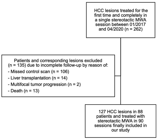 The indication for MWA was confirmed by an interdisciplinary tumor board for all the procedures. Before the MWA, all the patients were provided with comprehensive details and risks of the procedure, and informed consent was obtained. The ablation procedure was defined as successful if the ablation zone completely covered the margins of the original tumor lesion at the end of the ablation procedure. Technical failure, and thus, a residual tumor were defined as an HCC-typical arterial enhancement or wash out in the portal venous phase close to the borders of the ablation area in the control scan at the end of the ablation procedure or in control imaging at the first day following the ablation. Primary technical efficacy (PTE) was achieved if the first follow-up imaging showed no residual vital tumor tissue [16]. The data were collected retrospectively and consecutively from a database of patients with HCC who were treated by stereotactic MWA in a curative intention at our institution between 01/2017 and 04/2020. The included HCC lesions should be ablated for the first time and completely in a single session, thus, the patients who underwent re-ablations of previously ablated lesions and ablations with technical failure or ablations, where a tumor lesion was treated in more than one ablation session, i.e., the tumor was too large to be treated in one session, were excluded from the study. We evaluated the treated tumors regarding the LTP with follow-up imaging for at least 12 months (Figure 1). If the patients received a liver transplant (n = 14), died because of other reasons than tumor progression, complications from the intervention or complications from liver cirrhosis (n = 13), had a diffuse multifocal tumor progression, which made the follow-up regarding the LTP impossible (n = 2) or missed the follow-up imaging-appointments (n= 106) within the minimally required follow-up period, the corresponding lesions were excluded from the study. A flowchart of the patient selection process is provided in Figure 1, we included 127 HCC lesions in 88 patients who were treated in 90 stereotactic MWA sessions.