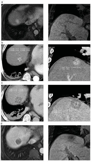 Example of minimal ablative margin assessment in MRI/CT scans of a 67-year-old man with HCC: (a) hepatic contrast-enhanced MRI (left: arterial phase, right: hepatobiliary phase) before MWA treatment; (b) contrast-enhanced planning CT scan (arterial phase) with pre-interventional measurements as performed in our study; (c) contrast-enhanced control CT scan (portal venous phase) after complete tumor ablation with postinterventional measurements; (d) contrast-enhanced follow-up MRI (left: arterial phase; right: hepatobiliary phase) 6 months after MWA with no evidence for local tumor progression.