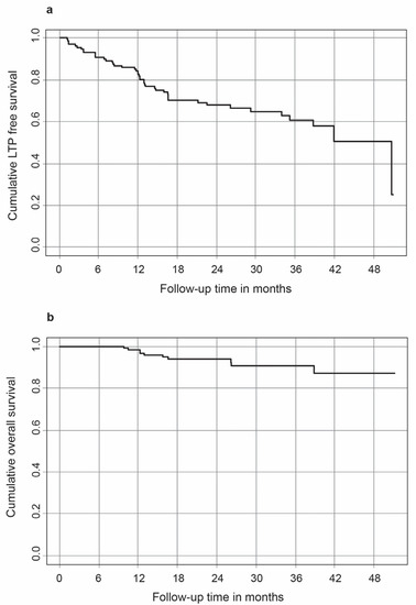 Kaplan–Meier curves for visualizing the probability of LTP free survival (a) and OS over time (b).