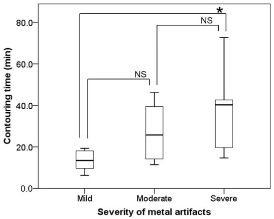 The relationship between the severities of metal artifacts (MAs) and the contouring time of the MAs area. A statistically significant difference between mild and severe MAs is shown (p = 0.020). Box plots indicate median, quartiles (25th and 75th percentiles), and extreme values for the contouring times in the three groups classified by the percentage of CT slices containing MAs. Bonferroni’s post hoc test was used for the statistical analyses. The level of statistical significance was set at 0.05. * p < 0.05. NS = not significant.