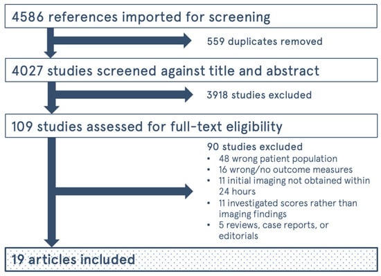 The search was limited to articles published in peer-reviewed journals in English from inception to September 2020. All imaging modalities were eligible for inclusion. Aside from reviews, editorials and case reports, all study types and designs were included. Studies were excluded if (1) there were no patients with TBI OR (2) initial imaging was not performed within 24 h of arrival to emergency department (ED) OR (3) there was no follow-up or patient outcome measures reported OR (4) the mechanism of insult was non-traumatic OR (5) patients less than 18 years of age were included OR (6) the study sample size was fewer than five individuals.