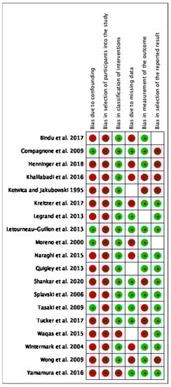 Risk of bias analysis for the included studies [,,,,,,,,,,,,,,,,,,]. Red indicates high risk of bias, blank indicates unclear risk of bias, and green indicates low risk of bias.