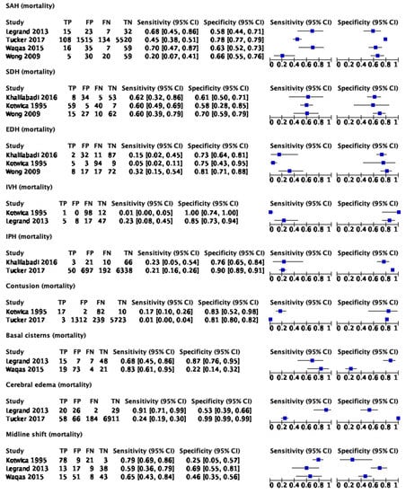 Forest plots for imaging findings and mortality in all TBI patients [,,,,,]. TP: true positive; FP: false positive; FN: false negative; TN: true negative.