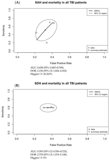 For the pooled data, only SDH with mortality in adult TBI patients had a moderate but significant association with AUC of 0.593 (95% CI: 0.556–0.725) and DOR of 2.755 (95% CI: 1.474–5.148). No other imaging finding had both a statistically significant AUC and DOR. Although a sensitivity analysis was not pursued, this result may be secondary to the inclusion and exclusion criteria of requiring all patients to be 18 years of age or older, and for imaging to be done within 24 h of presentation to ED. The result can also be secondary to selection bias in the pooled data and to significant heterogeneity in the included studies, particularly regarding outcome measures and the patient population studied.