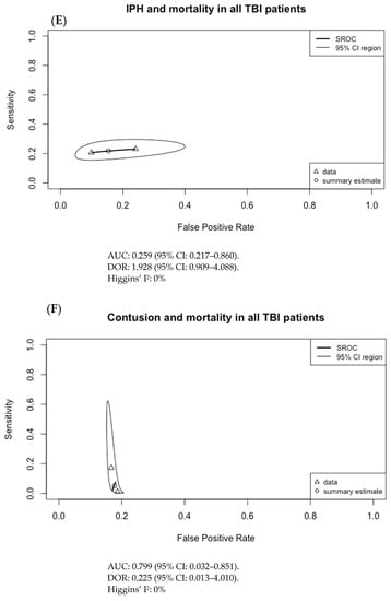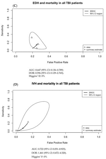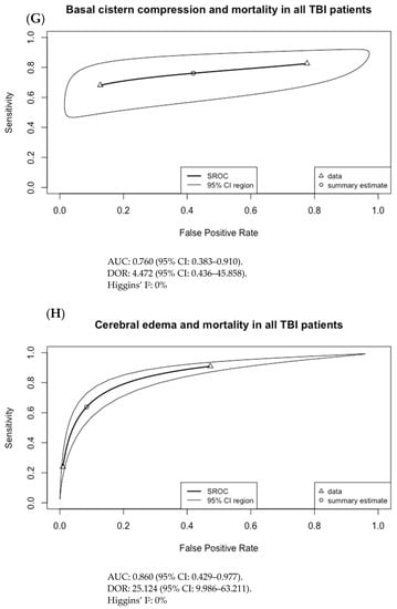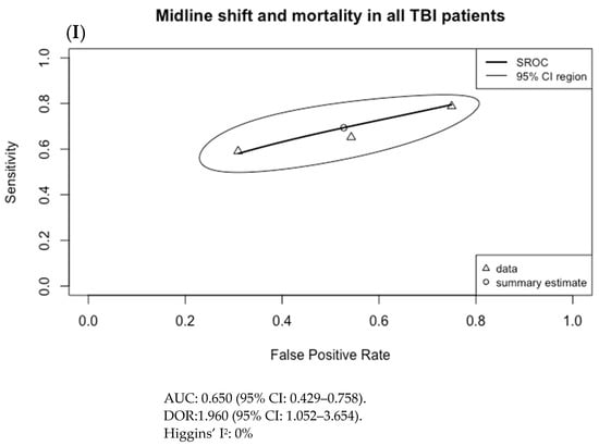 Summary ROC curves (SROC; bivariate model) for mortality in adult TBI patients for (A) subarachnoid hemorrhage (SAH), (B) subdural hematoma (SDH), (C) epidural hematoma (EDH), (D) intraventricular hemorrhage (IVH), (E) intraparenchymal hematoma (IPH), (F) cerebral contusion, (G) basal cistern compression, (H) cerebral edema, and (I) midline shift. Only SDH had both an AUC with 95% CI not crossing 0.5 and a DOR with 95% CI not crossing 1, at 0.593 (95% CI: 0.556–0.725) and 2.755 (95% CI: 1.474–5.148), respectively.