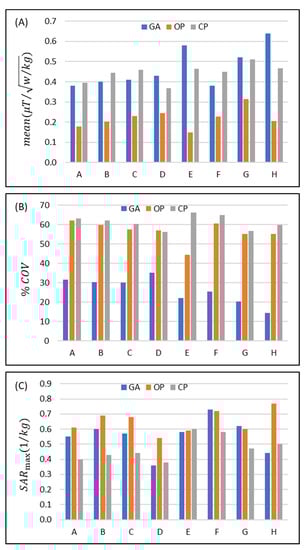 Assessment of the RF power deposition showed that average SAR10g,max (1 W input power) was below 0.8 (W/kg) for all RF transceiver array configurations and RF transmission field shaping approaches (Figure 3C). For most of the eight RF transceiver configurations, CP provided a lower SAR than GA or OP. The SAR obtained for the GA approach was similar to that of the OP algorithm or less. The maximum SAR10g,max derived from the GA approach for the loop–dipole (H) configuration was 12% and 43.8% less than the CP and OP counterparts.