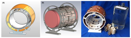 Based on the EMF simulations, the eight-loop–dipole configuration (H) was selected for manufacturing an RF transceiver array for use in phantom experiments. The computer-aided design and a photo of the manufactured prototype of configuration H, along with the phantom container and power splitters used for feeding the RF array, are shown in Figure 4.