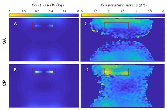 Simulation of point SAR maps (projection of maximum value) for a sagittal view of the phantom using GA- (A) and CP-based (B) transmission field shimming for 1 W input power along with temperature increase maps obtained for a sagittal view using GA- (C) and CP-based (D) shimming. The ROI containing the implant is indicated in red.