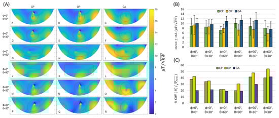 Next, the orientation of the implant was varied, and the maps measured, relative to the reference position (the implant was aligned with the long axis of the phantom). For convenient repositioning of the implant, the liquid-sucrose-based phantom was used. The implant orientations were defined using spherical coordinates where the origin was placed at the center of the implant, and polar (θ) and azimuthal (φ) angles defined the orientation. The transversal maps were acquired for slices through the center of the implant, where the implant-induced inhomogeneity of reaches a maximum. A summary of the maps obtained for the CP-, OP-, and GA-based shimming algorithms is shown in Figure 7A(A–R). For an orientation of , the implant-induced artefact reached a minimum (Figure 7A(J–L)). For this orientation, a minimal current is induced on the implant because the E-Fields of the RF transceiver array are almost parallel to the long axis of the RF transceiver. Other implant orientations revealed strong inhomogeneities in the vicinity of the implant for transmission field shimming using the CP or OP algorithm. The GA supported substantial improvements in the uniformity. For every implant orientation, GA transmission field shimming provided a combined mean and uniformity which was superior to the counterparts derived from CP and OP transmission field shimming.