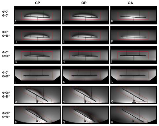 Minimum-intensity projections of worst-case artifacts obtained from 3D gradient-echo MRI in the vicinity of the implant using CP-, OP-, and GA-based transmission field shimming; (A–R) correspond to the excitation vector shown in Figure 7 for several implant orientations. The implant orientation is defined by using polar and azimuthal angles in spherical coordinates by considering the origin of the coordinate system on the center of the implant. The ROI under investigation is indicated in red.