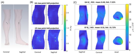 (A) Overview of the setup used for EMF simulations showing the positioning of the sample screw implant in the tibia of the human voxel model Duke. (B) Maximum point SAR projections obtained for the GA (top) and CP (bottom) approach for 1 W input power. (C) maps derived for slices through the center of the implant using the GA (top) and CP (bottom) approach. The ROI is highlighted in red.