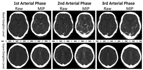 In the enrolled subjects, all the mCTA of these subjects were reviewed and graded by an experienced neuroradiologist. The collateral status of mCTA was graded based on the original concept of the development of mCTA []. The pial arterial filling score within the symptomatic ischemic territory using mCTA ranged from 0 to 5. A score of 5 meant good collateral status, 4 meant intermediate collateral status, and 0 to 3 meant poor collateral status. In a complete mCTA scan, there were a nonenhanced CT scan from head to neck, an arterial phase CT scan from head to neck, an 8 s delay arterial phase CT scan for the whole head, and a 16 s delay arterial phase CT scan for the whole head. The raw images were 1.5 mm on a Siemens SOMATOM Definition AS CT Scanner (Siemens Healthcare GmbH, Erlangen, Germany) and 1 mm on a Canon Aquilion PRIME CT Scanner (Toshiba Medical Systems, Nasu, Japan). Reconstruction with the maximum intensity projection (MIP) technique was applied on the first arterial phase CT images to produce axial, coronal and sagittal MIP images, as well as on the second and third arterial phase CT images, to produce axial MIP images. The settings of MIP were a 20 mm slice thickness with a 10 mm increment for axial reconstructed MIP images and a 10 mm slice thickness with a 4 mm increment for coronal and sagittal reconstructed MIP images. Two levels of the axial images were identified as the basal ganglion level and the supraganglion level. The basal ganglion level was the image when the size of the basal ganglion was visually measured at the maximum size. The supraganglion level meant the first image level when both lateral ventricles just disappeared on the axial images examined in a caudal to cranial sequence. There were 12 images selected from the mCTA study of each subject for further analysis using the AI technique. The 12 images included the raw image and the MIP image at the basal ganglion level and the supraganglion level from all three arterial phase images (Figure 1).