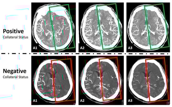 Demonstration of positive and negative collateral status on multiphase CTA. The A1, A2, and A3 indicate the three arterial phases. In the positive collateral status (upper row), the left side brain (green frame) is the ischemic side. When the enhancement of the arterial branches in the ischemic side can achieve similar appearance to the A1 contralateral normal side in A1 or A2 (this case), the collateral status is good or intermediate, respectively, and the result is defined as the positive collateral status. On the contrary, in the negative collateral status (lower row), the arterial branches in the ischemic side (red frame) cannot be enhanced like the A1 contralateral normal side in A1 or A2, suggesting that the collateral status is poor and the result is defined as the negative collateral status.