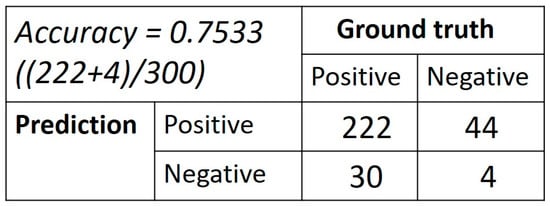 There were 57 cases (69.5%) randomly selected for the training group and 25 cases (30.5%) for the validation group. In the training group, there were 40 cases (70.2%) with a positive collateral result (good or intermediate collateral) and 17 cases (29.8%) with a negative collateral result (poor collateral). In the validation group, there were 21 cases (84.0%) with a positive collateral result and 4 cases (16.0%) with a negative collateral result. The confusion matrix of the validation group is displayed in Figure 4. During training for the CNN prediction model, the accuracy of the training group could reach 0.999 ± 0.015, whereas the prediction model had a performance of 0.746 ± 0.008 accuracy on the validation group (Figure 5). The ROC curve of this model demonstrated an area under the curve (AUC) of 0.7 (Figure 6).