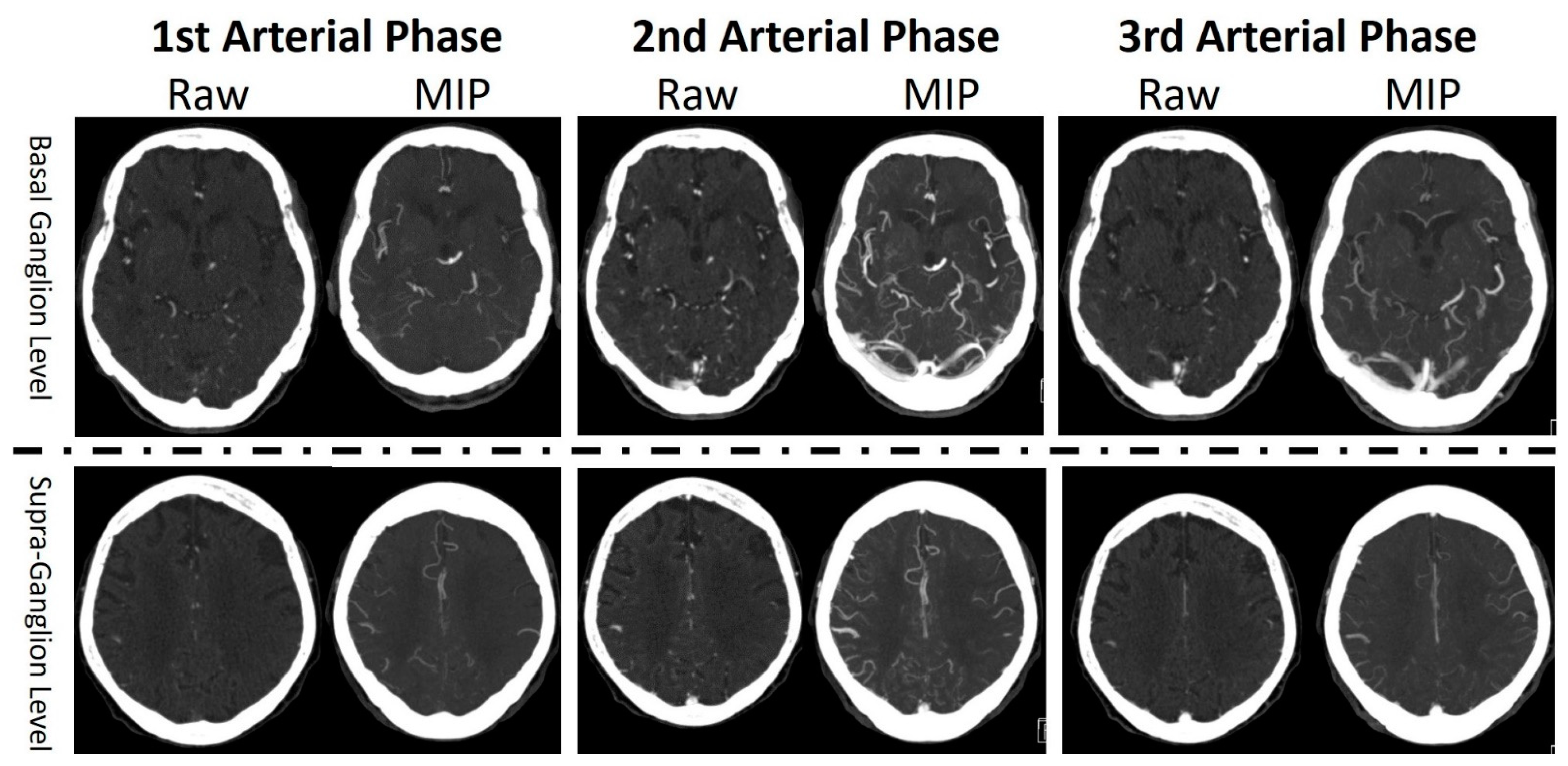 Multiphase computed-tomography angiography (mCTA) is a useful imaging tool to identify good candidates for EVT. mCTA includes an arterial phase and 2 subsequent venous phases, also known as 2 delayed arterial phases, and there will be three post-contrast images in mCTA. As compared with traditional single-phase CTA, mCTA is advantageous in the detection of arterial occlusion, with higher interrater reliability and in the evaluation of collateral status []. Another useful tool is computed-tomography perfusion (CTP), which can calculate the volumes of infarction core and ischemic penumbra, and these measurements can be automatically performed by some automated software []. These two techniques are both widely used in acute ischemic stroke. The strengths of CTP include higher correlation with clinical outcome and availability of automated postprocessing software. In contrast, mCTA does not require postprocessing software and is recommended by guidelines. However, the weak point of mCTA is that the evaluation relies on visual assessment, which might still compromise interrater and intrarater agreement and require additional time to evaluate the imaging results []. The management of acute ischemic stroke is as soon as possible to reverse blood flow for the ischemic brain in order to rescue these salvageable brain regions. If the results of mCTA could be evaluated automatically as CTP, the pre-EVT evaluation could be more efficient, which would be significantly beneficial for patients.