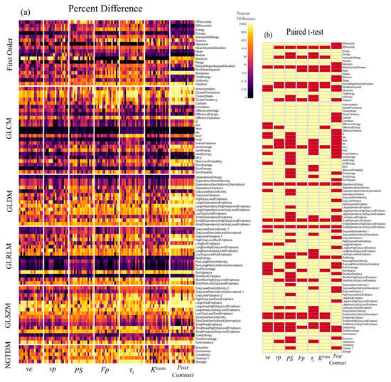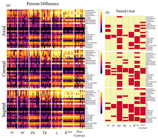 Percent difference and significance between features from isotropic and anisotropic (slice thickness of 1.014 mm) images. (a) A heatmap depicting the percent difference in histogram and texture features between isotropic parameter maps and up-sampled anisotropic maps (slice thickness of 1.014 mm in axial direction). (b) A heatmap showing the features that have a significant difference in radiomic features (p < 0.00054, depicted in red) between isotropic and anisotropic image resolution, which are over 32% of all features.