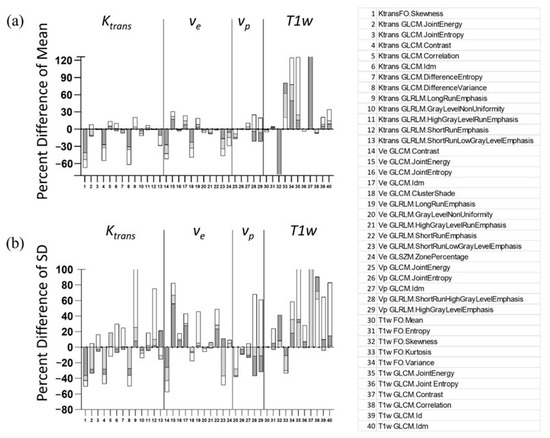Bar plots representing the percent difference of the means (a) and standard deviations (b) of the 40 features used in recent studies listed in Table 1 show the difference between isotropic and up-sampled anisotropic images. The number of features with mean values differing by more than ±10% are 22, 24, and 32 for slice thicknesses of 0.234 mm (dark gray), 0.546 mm (light gray), and 1.014 mm (white), respectively. The number of features with SD values >10% is 22, 23, and 32, respectively. The percent difference of mean fell outside of the axis range for T1-w FO skewness (−217%, −268%, and −275%) and T1-w GLCM Contrast (165%,194%, and 253%). The percent difference of SD fell outside of the axis range for Ktrans GLRLM Long Run Emphasis (8%, 25%, and 196%), T1-w FO Variance (36%, 31%, and 375%) and T1-w GLCM Contrast (187%, 151%, and 232%).