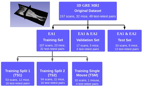 The MHD images were used for DL model training and data analysis. The experimental design is shown in Figure 1. The available dataset was split into training (18 diseased mice, five controls: 107 scans), validation (two diseased mice, one control: 17 scans), and test (six diseased mice: 33 scans) subsets to approximately balance by scan number (70%/10%/20%). The validation and test subsets were not altered during evaluation. Due to the small number of normal mice and our intended application for disease segmentation, their scans were included only in training (21 scans) and validation (six scans) sets. The full training set included 32 test–retest pairs, validation set contained four pairs, and test set had 13 pairs. To assess model sensitivity to the training set (TS) size, the full TS was split into three training subsets (Figure 1). Training split 1 (TS1) and training split 2 (TS2) each contained roughly half of the training data. Each split was balanced on the basis of test–retest pairs. The training single mouse (TSM) subset consisted of a single mouse randomly selected with a long time-series of (six biweekly scans), with four test–retest pairs.