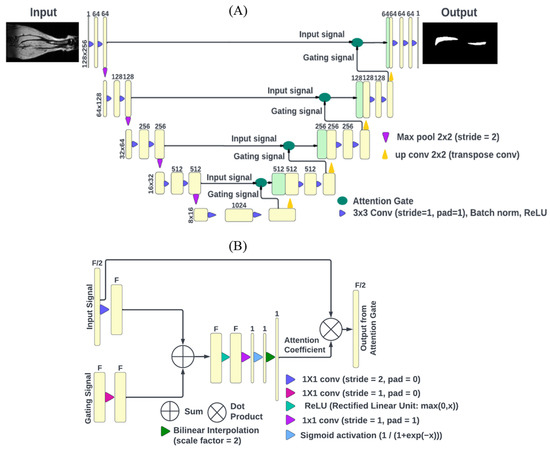 The attention gate (Figure 2B) was described in [23]. Briefly, it takes the input signal (shape: (N,F/2,2H,2W)) and gating signal (shape: (N,F,H,W)) from two different stages, where the input signal and the gating signal have different sizes. The convolutions applied to the input signal (filter size = 1 × 1, stride 2, output size = F) and the gating signal (filter size = 1 × 1 and stride 1, output size = F) equalize their sizes, which are then added, and the rectified linear unit (ReLU) activation function is applied, followed by convolution (filter size = 1 × 1, stride =1, pad = 1, output size = 1) and sigmoid activation. Next, bilinear interpolation is applied to double the height and width to match that of the input signal, producing an attention coefficient array (N,1,2H,2W). The dot product of the attention coefficients with the input signal is the output from the attention gate that emphasizes the important features for image segmentation in the expanding path of the network (Figure 2A).