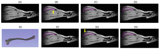 Examples of mouse tibia segmentation contours (magenta) for a single-slice MRI image in the test set (A) delineated by expert annotators ((B) EA1; (F) EA2) and by DL model with different training scenarios (C) full training; (D) TS1; (G) TSM; (H) TS2). (E) The full tibia 3D volume (6.5 mm3) segmentation by EA1. The yellow arrows indicate apparent tibia under-segmentations in (B) and (G).