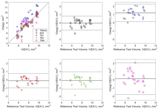 The relative accuracy of the model volume segmentations for the test subset (Figure 1) was also assessed by comparison to the EA1 reference via Bland–Altman (BA) analysis [9] and the agreement was quantified by Pearson correlation, R. BA analysis was also used to evaluate test–retest repeatability for volume segmentations by individual expert annotators and DL models trained on different data subsets. Bland–Altman plots provided a graphic view of agreement.