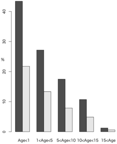 Figure 1 shows the percentage (%) of children who had the initial examination at different ages. It also shows the percentage of children who had undergone surgery. Since surgery accounts for approximately half of the total, the effect of surgery on the NCT was analyzed.