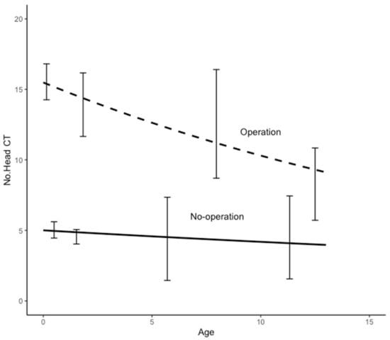 Although head examinations account for 63.9% of pediatric CTs, it is not always the case that only head examinations are performed on the same patients. Therefore, we examined the number of patients who received both non-head examinations and head examinations and added the relationship with the number of head examinations as a variable in the Poisson regression. This result showed a tendency for the model fit to improve, indicating the influence of the number of non-head examinations. Two or more non-head examinations were performed in 12.4% of cases of trauma and 13.5% of cases of hydrocephalus. For hydrocephalus, Poisson regression was performed on the number of head examinations (y), starting age (x1), duration of examination (x2), and the number of non-head examinations (x3) to develop a log-linear model, divided into groups by the presence/absence of surgery. In the group with surgery, the head NCT increased with the non-head NCT (β = 0.03 (95% CI: 0.01,0.05)). In the no-surgery group, no significant effect was found (β = −0.088 (95% CI: −0.229,0.044)).