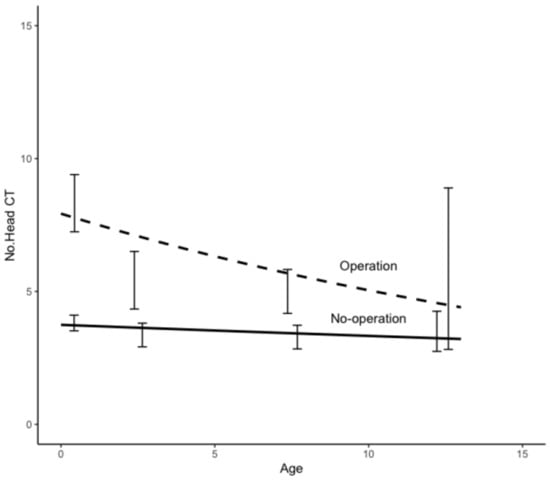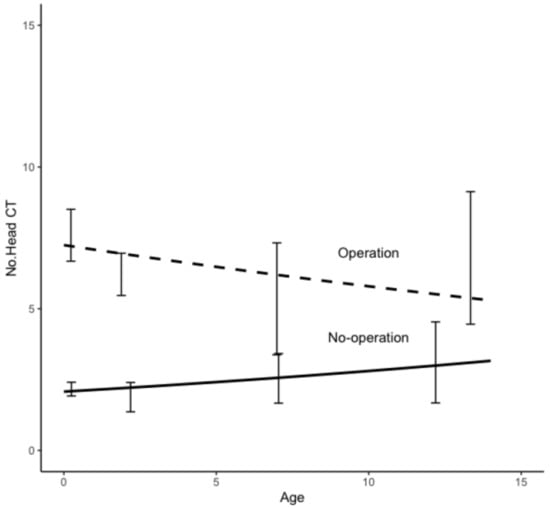 This study revealed the characterization of the frequency of pediatric head CT examinations. The head exams accounted for 64% of the NCT, of which 43% were performed on children less than a year old. Since half of these examinations involved surgery, there was a clear trend toward an increase in the number of head CT examinations (NHCT). The mean number of CT examinations performed on children less than 5 days old tended to be higher than those of other ages at the initial examinations. Most of these cases in which CT and surgery were performed within a few days of birth had already been diagnosed by ultrasound during the fetal period with congenital malformations that require emergency surgeries. This was related to the higher proportion of patients with surgery. The NHCT was influenced by the duration of the examination even after taking the effect of surgery into account. The statistical results showed that a longer examination period implies continued long-term examinations, which resulted in an increase in NHCT. The age at which CT examinations began differed by disease, with a significant effect for hydrocephalus, but not for trauma. Comparing hydrocephalus with trauma where the purpose of the examination was clearly different, the mean NHCT differed at less than 1 year of age without surgery, at 5.0 (95% confidence interval: 4.4,5.6) for hydrocephalus and 3.8 (95% confidence interval: 3.5,4.1) for trauma. At less than 1 year of age with surgery, there was a marked difference between hydrocephalus, with a mean = 15.5 (95% CI 14.3,16.8), and trauma, with a mean = 8.3 (95% CI 7.2,9.4). It was obvious that surgery increased the duration of examinations, which also increased the number of examinations. Trauma and hydrocephalus are diseases with high NHCT. The results of our study were consistent with other studies conducted in Japan [,] and the UK []. The finding that children with hydrocephalus received higher NHCT than those with other conditions was consistent with the UK study []. Mild traumatic brain injury is the most common, accounting for 80–90% of all traumatic brain injuries []. In our study, the patients who underwent head CT examinations without surgery accounted for 72%. This difference may be related to the fact that the children’s center hospital where the survey was conducted is characterized by a concentration of children with severe cases. Routine repeated head CTs may result in unnecessary exposure if children have mild brain injuries []. The present study indicated that the mean NHCT without surgery was 3.4 to 3.8 independent of the starting age, which was markedly lower than the mean values with surgery. The number of non-head examinations was affected by the NHCT even after considering the age at the initial examination, examination duration, and the presence or absence of surgery. Few studies have investigated the correlation between the NCT of the head and other parts. A possible explanation would be that CT imaging other than of the head was performed because of suspicion of other diseases. The correlation between the NCT of the head and other parts means that it may be not easy to simplify the reasons for performing CT examinations.