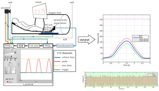 Figure 1 is a schematic that shows the positioning, visual feedback, force measurement and scan trigger setup. The dominant leg was placed into the foot pedal with the cardiac flex coil wrapped around the lower leg (the cardiac rather than a smaller coil was used in order to accommodate the foot pedal). The foot pedal device allowed for positioning and anchoring the foot at different ankle angles. In this study, the foot was positioned at three nominal angles—dorsiflexion (DF) 5°, neutral (N) −25°, and plantarflexion (PF) −40°. A large FOV image that included the ankle was collected at each foot position using the body coil to verify/estimate the ankle angle.