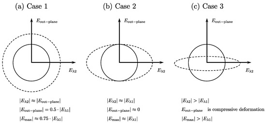 Eλ1. In this case, the deformation in the fiber cross-section is such that the radial expansion in the in-plane direction exceeds that of the compressive strain in the fiber direction. From the incompressibility of the muscle tissue, this will lead to a compressive deformation in the out-plane direction. The maximum shear strain will be greater than