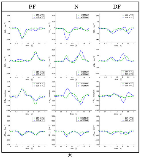 Table 2). The absolute value of the normalized strain/SR indices was higher for the lower %MVC than for the higher %MVC: this implies a lack of linearity between strain and %MVC and that larger contraction/force (strains) is needed to achieve lower %MVCs. This may also arise from the MG contributing more to force production at lower %MVCs and the soleus contributing more at the higher %MVCs. All the normalized strain and strain rate indices were lower in the dorsiflexed position than in the plantarflexed or neutral ankle positions and most of these changes were significant (