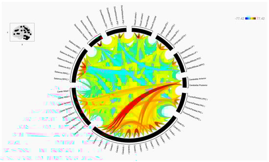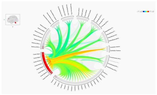 The statistical analyses were performed at two statistical levels: subject and group levels. At the first level of analysis (subject’s level), matrices of regions of interest (ROI)-to-ROI connections between and among the termed ROIs were calculated for each participant using weighted general linear bivariate correlation models. Bivariate Fisher-transformed correlation coefficients between the pair ROI time series were used to build these matrices. The Fisher transformation, given by the equation z = 0.5 × ln((1 + r)/(1 − r)), where r is the correlation coefficient, allows for more accurate confidence intervals and hypothesis testing. The transformation converts Pearson’s correlation coefficients into z-scores, which follow a normal distribution and are easier to work with statistically. At the second level of analysis (group’s level), functional connectivity measures were calculated and compared using group-level statistical analysis, T-tests, and/or F-tests where appropriate, identifying and comparing the rsfMRI networks connected to each of the cerebellar regions. The standard of statistics for the results is displayed using a corrected false discovery rate (FDR) (p < 0.05) (multivariate statistics parametric (MVPA) omnibus test) [18]. With this approach, every connection is effectively subjected to a multivariate parametric general linear model analysis. Moreover, to better understand the functional connectivity within the brain, visualizations were generated using a matrix-based functional display. This approach, as defined in the CONN software, allows for the comprehensive analysis and interpretation of the complex relationships between different brain regions, ultimately providing valuable insights into their interactions and functional integration.