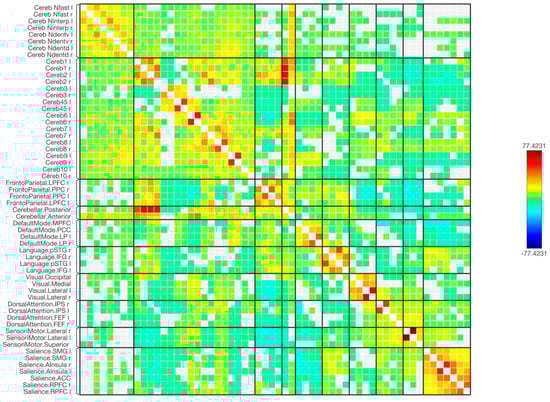 Figure 4. The matrix of the functional connectivity of the cerebellar lobules and their nuclei as well as the targeted brain networks is shown along with the statistical indications of the strength of the connection.