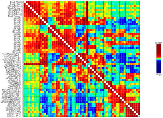 Figure 5. The matrix of the functional connectivity of the cerebellar lobules and their nuclei as well as the targeted brain networks is shown along with the statistical indications of the strength of the connection. In this figure, the connectivity was set with a statistical equalizer threshold (same threshold with a fixed color bar) to easily distinguish strong, weak, and negative connections.