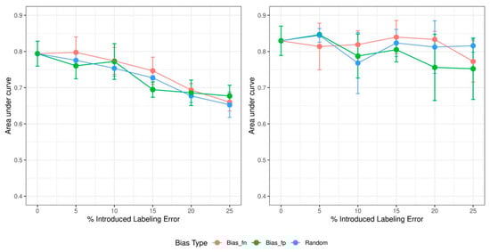 The statistical analysis indicated that the differences in the models’ AUC slopes between false negative and false positive biases for both models are not statistically significant (false positive: β = −0.005 with p = 0.005; false negative: β = −0.0045 with p = 0.002; and random error: β = −0.0043 with p = 0.0002. The difference between the slopes: p = 0.74 for the baseline model; false positive: β = −0.0037 with p = 0.02; false negative: β = −0.0012 with p = 0.36; and random error: β = −0.0006 with p = 0.66. The difference between the slopes: p = 0.18 for the improved model). All descriptive statistics of the models trained using different strengths and types of biases are shown in Supplementary Table S1.