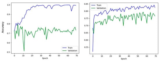 It is also observed from Figure 1 that as the AUC decreases due to bias, the baseline model’s accuracy decreases. This is mainly due to overfitting, when the model learns the training data so well that it fails to generalize to unseen data. The training and validation accuracy throughout the training process is illustrated in Figure 2. The figure indicates that the gap between training and validation accuracy is larger in the baseline model than that in the improved model.