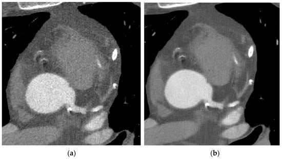 Figure 1, the DLIR (b) shows image quality improvement with reduced image noise and better-defined anatomical details, when compared with the ASIR-V(a).
