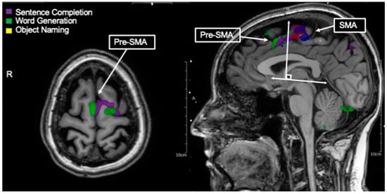 - Krainik, A.; Lehéricy, S.; Duffau, H.; Capelle, L.; Chainay, H.; Cornu, P.; Cohen, L.; Boch, A.-L.; Mangin, J.-F.; Bihan, D.L.; et al. Postoperative speech disorder after medial frontal surgery: Role of the supplementary motor area. Neurology 2003, 60, 587–594. [Google Scholar] [CrossRef] [PubMed]